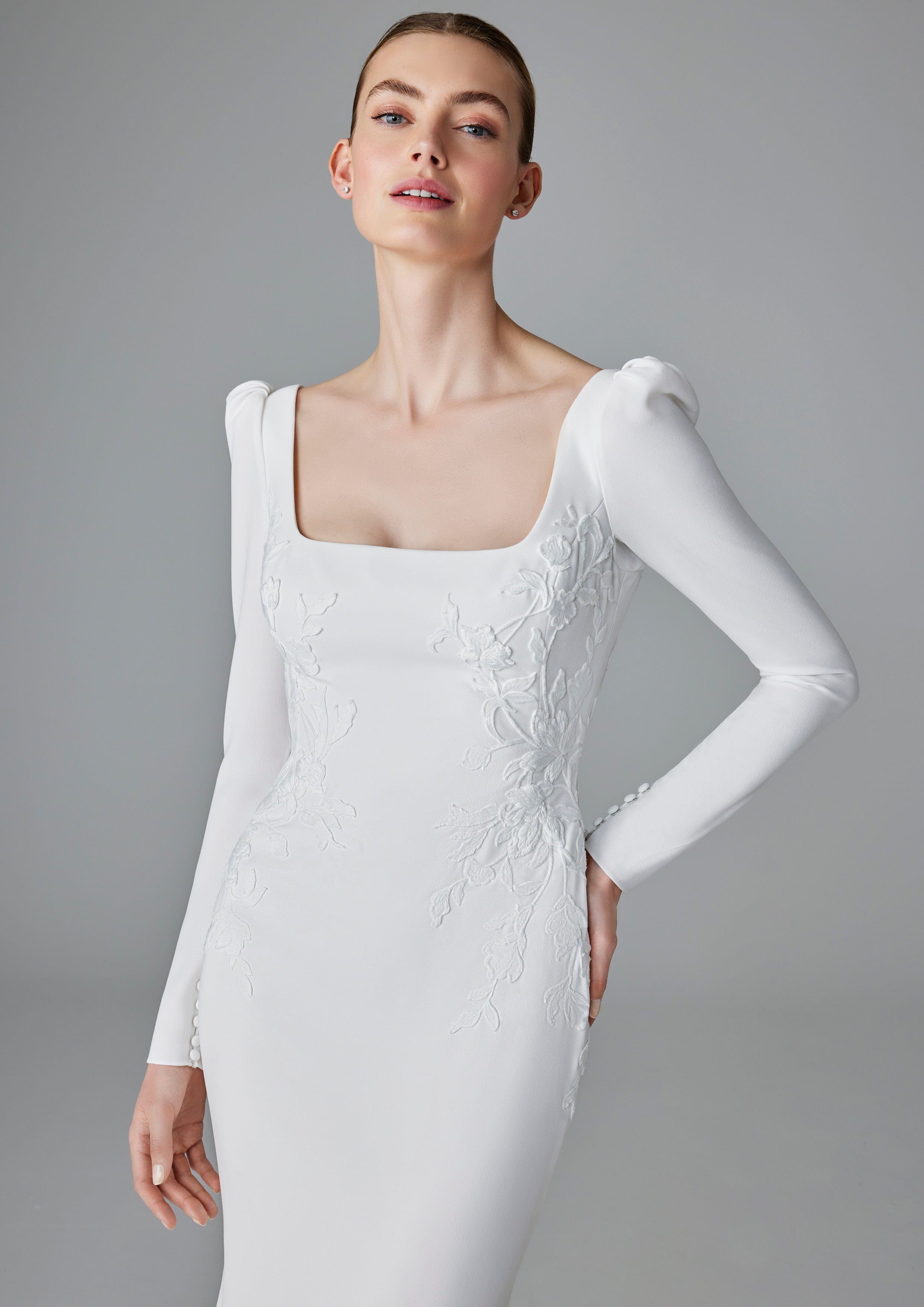 The sophisticated MALLORY gown exudes a sense of elegance fit for royalty. This mermaid-cut design boasts a square neckline and subtle lace details on one side, all crafted from crepe. The long sleeves with a slight puff are ideal for mild and cool temperatures, while the skirt flatters the bride's figure. As a finishing touch, add a removable cape to elevate the overall look.